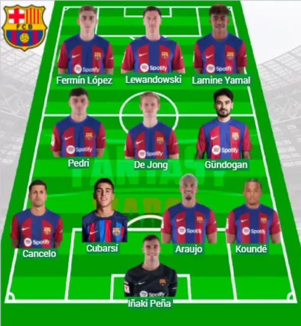 إيناكي بينيا؛ كوندي، كوبارسي، أراوخو، كانسيلو؛ بيدري، دي يونج، جوندوجان؛ لامين يامال، ليفاندوفسكي، وفيرمين لوبيز.