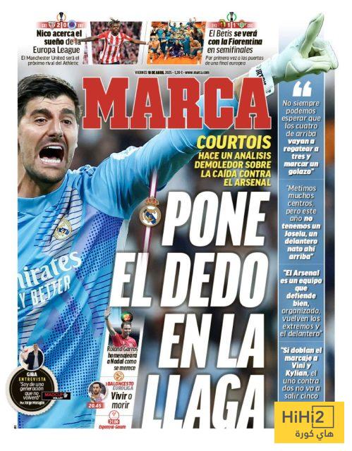 هاي كورة – تصدر غلاف صحيفة ماركا الإسبانية تصريحات قوية لحارس مرمى ريال مدريد، تيبو كورتوا، عقب الخروج الأوروبي أمام أرسنال.