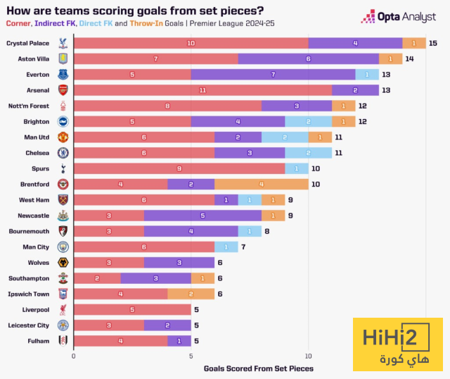 كريستال بالاس سجل 15 هدفا من خلال ركنيات او مخالفات مباشرة او غير مباشرة من اصل 41 هدفا سجلهم في الدوري الممتاز .