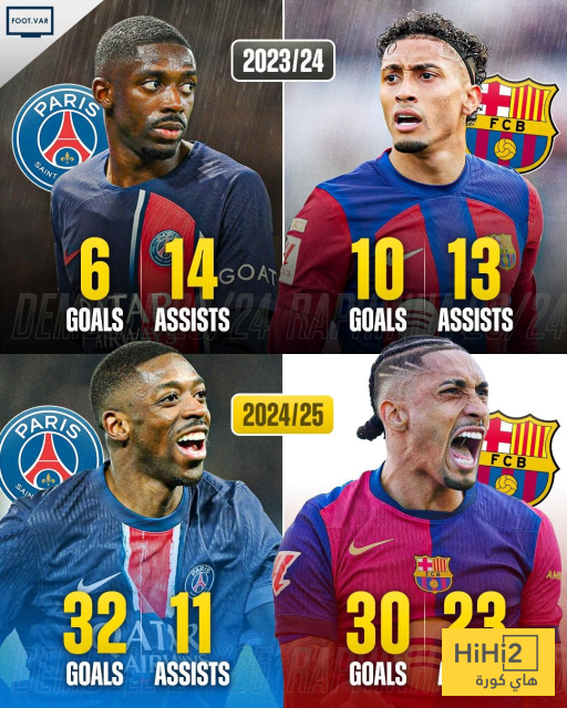 ديمبلي كان اكثر تحولا بعدما اكتفى الموسم المنصرم بتسجيل 6 اهداف و معهم 14 اسيست بينما في الموسم الجاري بلغ عداده 32 هدفا تسجيلا و 11 هدفا صناعة ليصل الاجمالي الى 44 مساهمة .