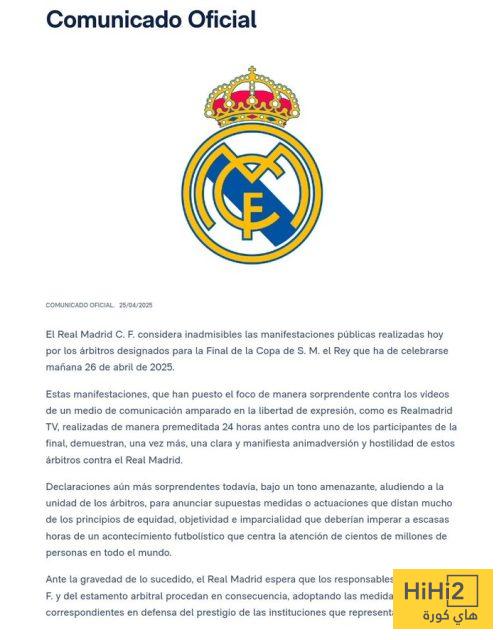 يعتبر نادي ريال مدريد التصريحات العلنية التي أدلى بها اليوم الحكام المعيّنون لنهائي كأس جلالة الملك، والذي سيُقام غدًا 26 أبريل 2025، غير مقبولة على الإطلاق.