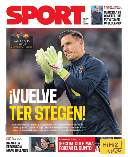 هاي كورة- تصدر مارك أندريه تير شتيغن غلاف صحيفة سبورت الكتالونية بعد تأكيد مشاركته أساسيا ضد بلد الوليد مساء اليوم السبت في الجولة الـ 34 من منافسات الليغا.