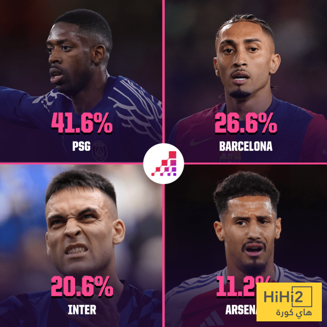 أما أرسنال، فتراجعت حظوظه إلى 11.2% فقط، بعد أن كان مرشحًا بنسبة 31.3% قبل مباراة الذهاب.