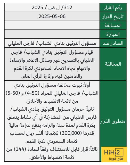 هاي كورة – أصدرت لجنة الانضباط والأخلاق التابعة للاتحاد السعودي لكرة القدم قرارًا صارمًا بحق فارس العلياني، مسؤول التوثيق بنادي الشباب، حيث تم حرمانه من المشاركة في أي نشاط يتعلق بكرة القدم لمدة عام كامل.