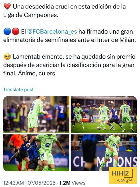 “برشلونة قدّم ملحمة كروية رائعة في نصف النهائي أمام إنتر ميلان، ورغم أن الحلم تبخّر في اللحظات الأخيرة، فإن الفريق خرج مرفوع الرأس، تشجيعنا لكم، يا كتالونيين.”