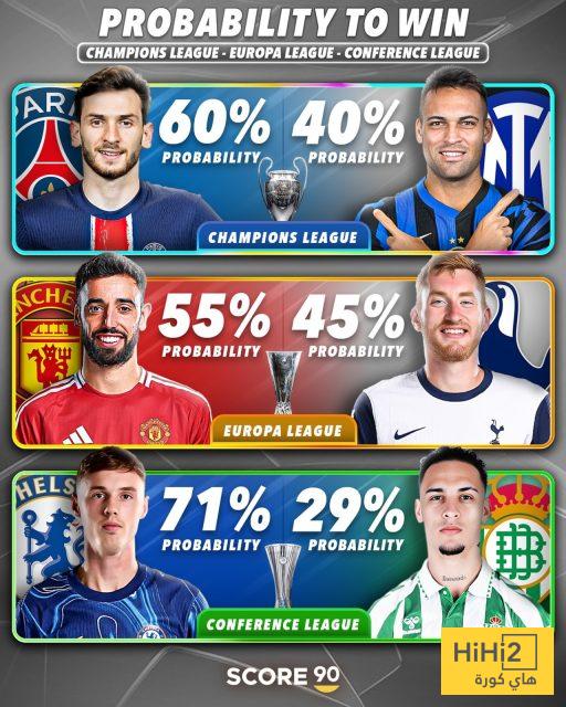 توقعات الذكاء الاصطناعي حددت حظوظ الأندية الستة في التتويج القاري قبل إجراء المباريات النهائية الثلاث: في 21 مايو للدوري الأوروبي، في 28 مايو لدوري المؤتمر، وفي 31 مايو لدوري الأبطال، حيث جاءت التكهنات على النحو التالي: