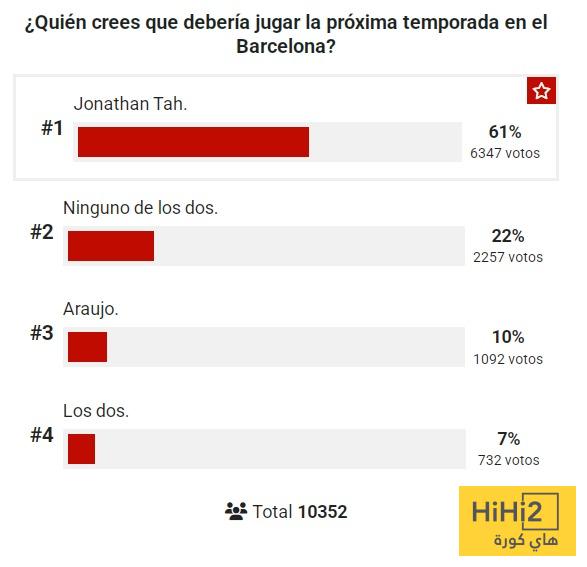 هاي كورة – أجرت صحيفة ماركا الإسبانية استفتاءً لمعرفة رأي الجماهير حول بقاء رونالد أراوخو ضمن صفوف برشلونة الموسم المقبل، في ظل تراجع مستواه، أو التعاقد مع جوناثان تاه، مدافع باير ليفركوزن.