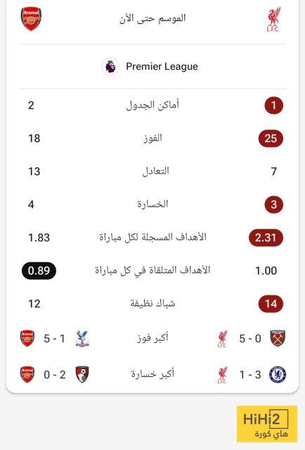 فيما يلي مقارنة بين أرقام ليفربول وأرسنال في الدوري هذا الموسم:
