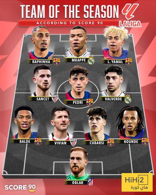 التشكيلة ضمّت ثنائي ريال مدريد، كيليان مبابي وفالفيردي، وسداسي برشلونة كوندي، كوبارسي، بالدي، بيدري، رافينيا، ولامين يامال، وجاءت على النحو التالي: