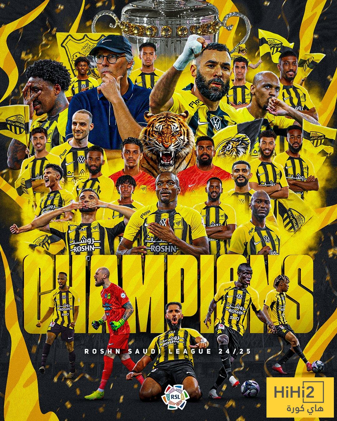 هاي كورة – توج فريق الاتحاد، بلقب دوري روشن السعودي للمحترفين بشكل رسمي، عقب الفوز على منافسه الرائد بثلاثية مقابل هدف وحيد، في المباراة التي جمعتهما مساء اليوم، ضمن منافسات الجولة 32.