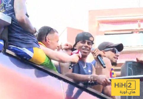 هاي كورة- سخر لامين يامال نجم برشلونة وزميله مارك كاسادو من الغريم ريال مدريد أثناء الاحتفالات بالتتويج بالثلاثية الدوري الاسباني ، كأس ملك اسبانيا ، وكأس السوبر.