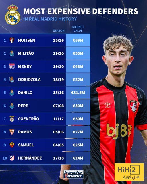 بذلك، أصبح هويسين أغلى مدافع يتعاقد معه النادي في تاريخه، وفقًا لموقع “ترانسفير ماركت”، ويليه كل من: