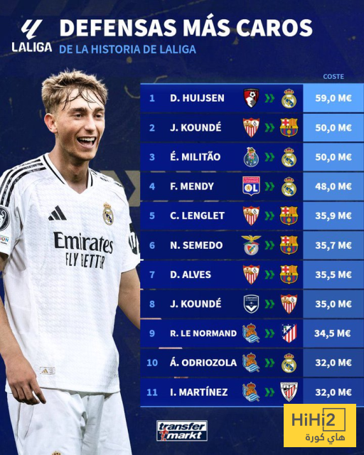 هاي كورة- كشفت شبكة Transfermarkt عن قائمة أغلى صفقات المدافعين في تاريخ الدوري الإسباني (الليغا)، وجاء على رأس القائمة المدافع الإسباني الشاب دين هويسن الذي انتقل إلى ريال مدريد مقابل 59 مليون يورو قادمًا من بورنموث.