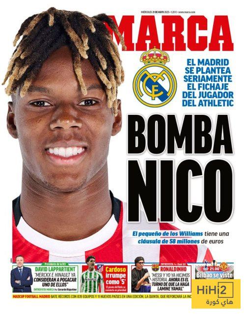 هاي كورة- أفادت صحيفة ماركا الإسبانية أن ريال مدريد دخل في مرحلة متقدمة من التفكير في التعاقد مع الجناح نيكو ويليامز، لاعب أتلتيك بلباو، حيث يُخطط النادي الملكي لدفع قيمة الشرط الجزائي البالغة 58 مليون يورو لضمه في سوق الانتقالات الصيفي.