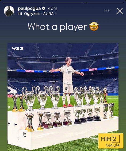 هاي كورة – نشر بول بوغبا عبر حسابه الرسمي على إنستجرام صورة للاعب ريال مدريد لوكا مودريتش مع مجموعة البطولات التي حققها مع الفريق الملكي، وذلك أثناء استعراضها في ملعب سانتياغو برنابيو بعد خوض الكرواتي آخر مباراة له على أرضه مع النادي الإسباني.