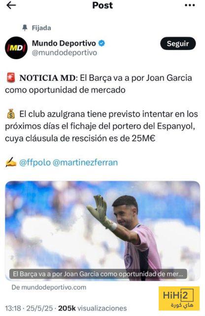 هاي كورة– بعد ساعة واحدة فقط من تقرير صحيفة موندو ديبورتيفو التي أكدت اهتمام برشلونة بخوان غارسيا كهدف رئيسي لحراسة المرمى في فترة الانتقالات الصيفية، جاء أول رد فعل من الحارس الإسباني.