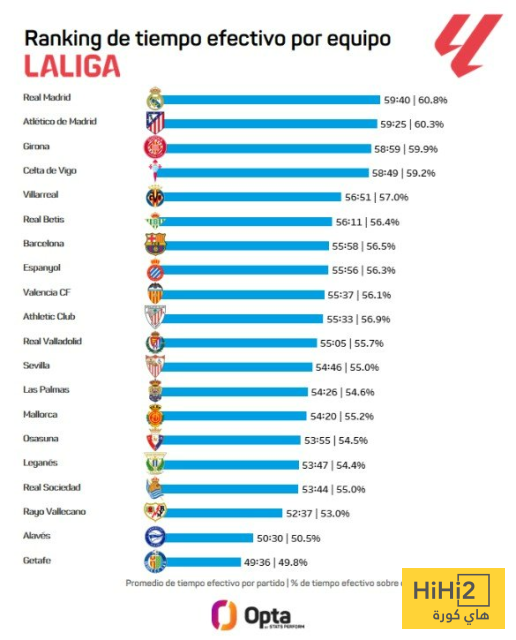 ريال مدريد تصدر الترتيب من حيث متوسط وقت اللعب الفعلي خلال الموسم ، حيث بلغ معدله 59 دقيقة و40 ثانية في كل مباراة.
