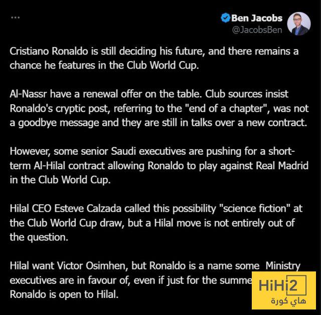 ختامًا، أوضخ بن جاكوبس أنه من المتوقع أن يتخذ رونالدو قراره النهائي بشأن مستقبله خلال الأسبوعين المقبلين، مما يترك الجماهير في حالة ترقب لما ستسفر عنه هذه المفاوضات.