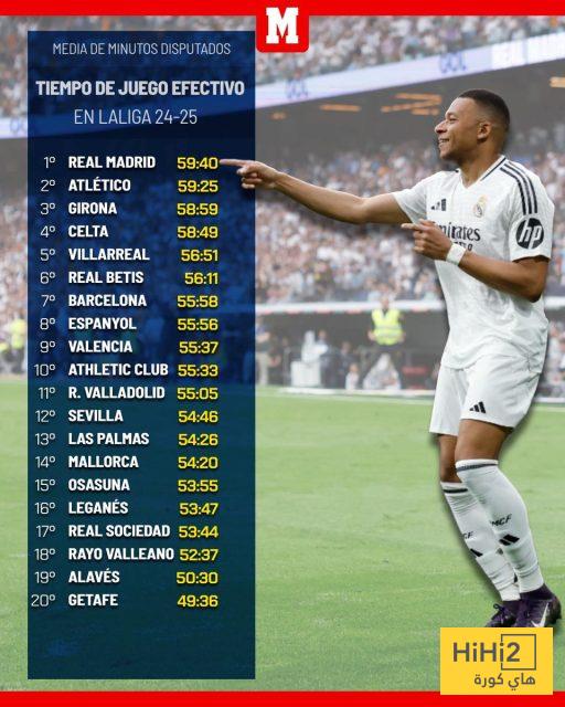 واحتل أتلتيكو مدريد المركز الثاني بمتوسط (59:25)، يليه جيرونا (58:59) وسيلتا فيغو (58:49)، بينما جاء برشلونة بطل الليغا في المركز السابع بمتوسط 55 دقيقة و58 ثانية فقط، رغم امتلاكه لاعبين يُعرفون بالاستحواذ والتحكم بالكرة.