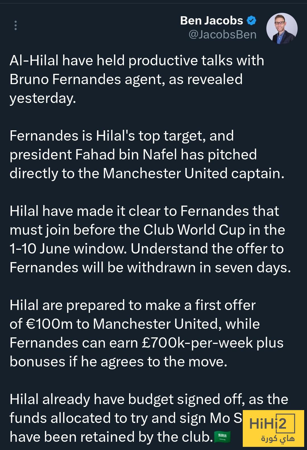 أوضح أيضًا أن رغبة الهلال هي أن يضم فرنانديز قبل كأس العالم للأندية، نظرًا لمدى أهمية البطولة.