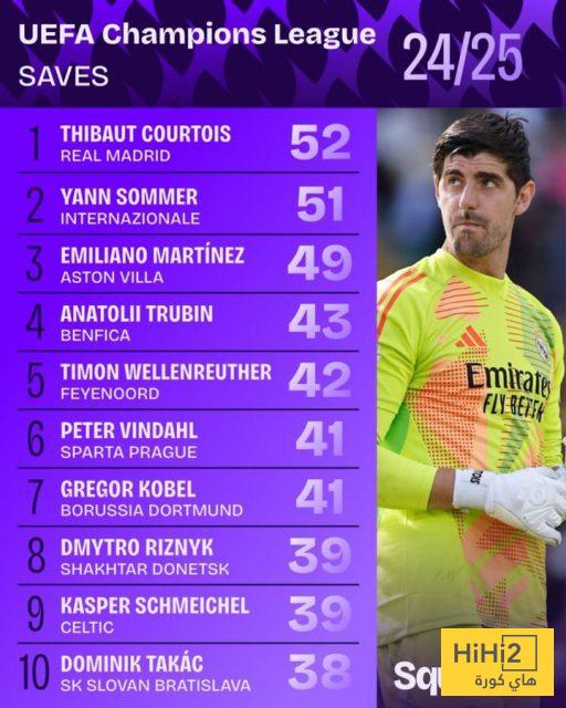وجاء خلفه مباشرةً يان سومر حارس إنتر ميلان بـ51 تصديًا، في حين احتل الأرجنتيني إيميليانو مارتينيز المركز الثالث برصيد 49 تصديًا، في موسم أوروبي ناجح لفريق أستون فيلا.