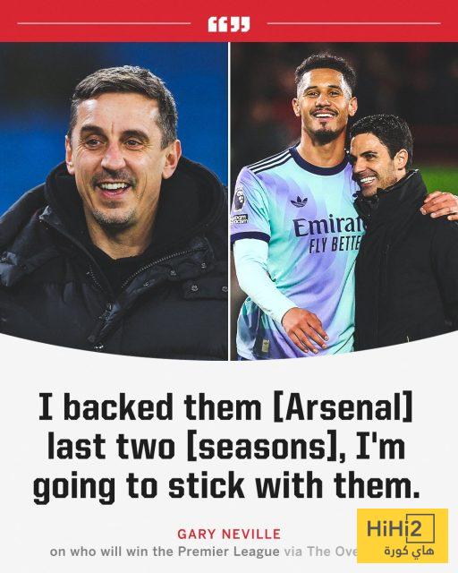 وقال نيفيل: “رشحت آرسنال في الموسمين الماضيين، وسأستمر في ترشيحه”، في إشارة واضحة إلى إيمانه بمشروع المدرب ميكيل أرتيتا والتطور الذي أظهره الفريق اللندني خلال المواسم الأخيرة.