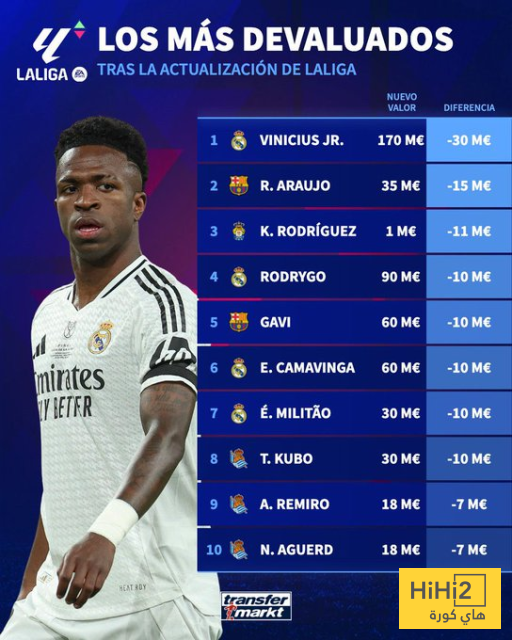 فينيسيوس جونيور نجم ريال مدريد تصدر القائمة حيث انخفضت قيمته 30 مليون يورو لتصبح 170 مليون يورو ، وسبب ذلك يرجع لأدائه الباهت في الموسم المنصرم .