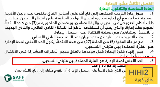 حيث تشير اللائحة لعام 2024 باسم ( لائحة الاحتراف واوضاع اللاعبين وانتقالاتهم ) وفي صفحتها الثامنه عشر – المادة 36 والتي تفصل نظام الاعارة حيث ينص البند الخامس على التالي :