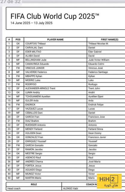 هاي كورة- كشفت الصحفية أرانشا رودريغيز عن القائمة الرسمية لأرقام قمصان لاعبي ريال مدريد المشاركين في بطولة كأس العالم للأندية 2025، التي ستقام في الولايات المتحدة بين 15 يونيو و13 يوليو.