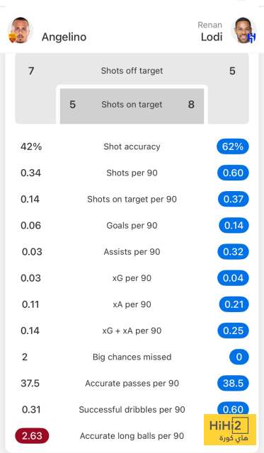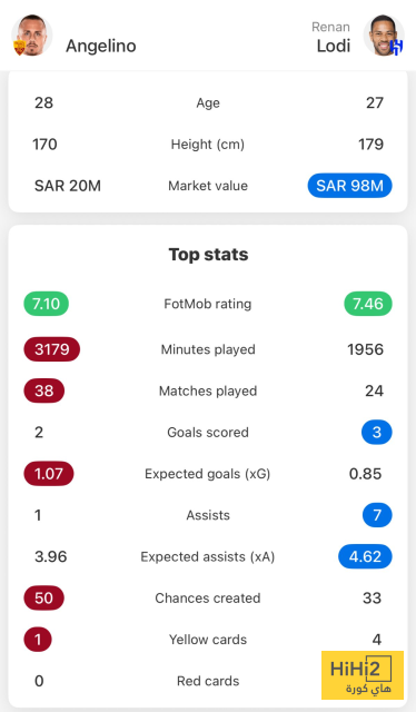 2_مساهمات أنجيلينو التهديفية الموسم الماضي 3 مساهمات فقط وهذا يعكس عدم تميزه الهجومي بعكس لودي الذي ساهم تهديفيا ب10 مساهمات بين تسجيل وصناعة في عدد مباريات أقل فالأسباني شارك في 38 مباراة بينما البرازيلي شارك في 24 مباراة فقط