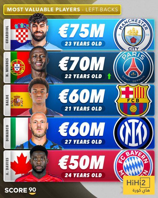 هاي كورة – كشف موقع “Score 90” عن تصنيف جديد لأغلى 5 لاعبين في العالم في مركز الظهير الأيسر، وفقًا للقيمة السوقية على “ترانسفير ماركت”، حيث تصدر الكرواتي غفارديول القائمة بقيمة بلغت 75 مليون يورو.