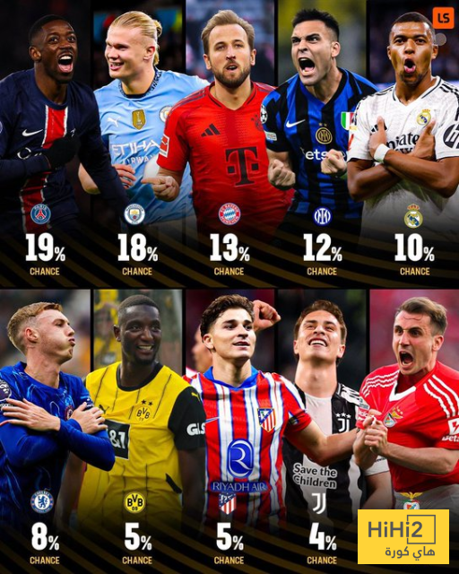 اوبتا اعطت بطل دوري ابطال اوروبا النسبة الاعلى للفوز باللقب والتي بلغت 19% ، يليه مانشستر سيتي بنسبة 18%، بينما بلغت فرص ريال مدريد 10% فقط .
