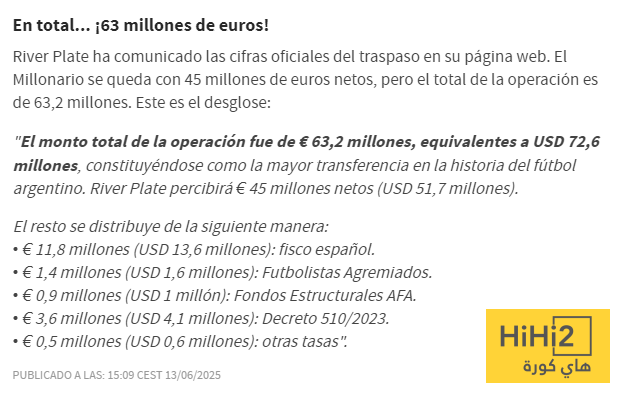 وأوضح ريفر بليت أن النادي سيحتفظ بمبلغ 45 مليون يورو صافي (ما يعادل 51.7 مليون دولار)، بينما تم توزيع باقي المبلغ على عدة جهات وفقًا للتفاصيل التالية: