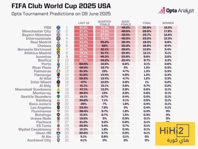 هاي كورة – كشف نموذج الذكاء الاصطناعي الخاص بشركة “OPTA” أن ريال مدريد ليس من بين أبرز المرشحين للفوز بلقب كأس العالم للأندية، المقرر انطلاقها غدًا في الولايات المتحدة الامريكية.