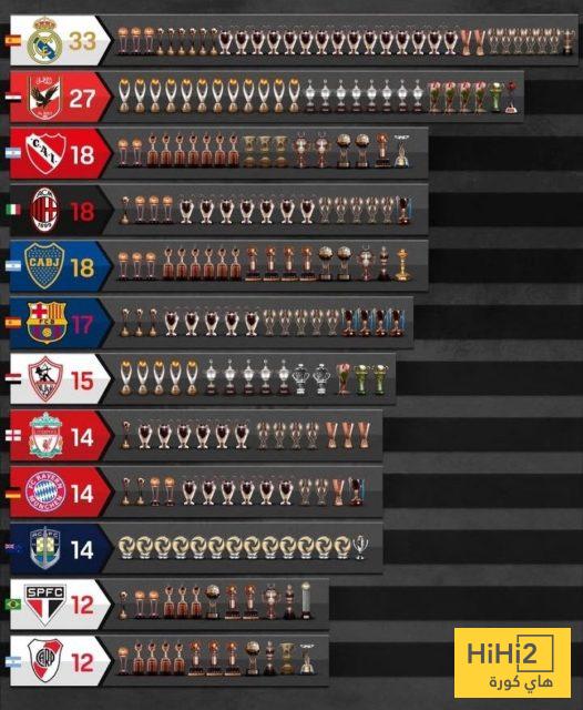 ويأتي الأهلي المصري في المركز الثاني برصيد 27 بطولة، ما يعكس تفوقه القاري والإقليمي، بينما يحتل نادي ريفر بليت الأرجنتيني المركز الثالث بـ18 بطولة، متساويًا مع مواطنه بوكا جونيورز وميلان الإيطالي اللذين يملكان نفس الرصيد من الألقاب.