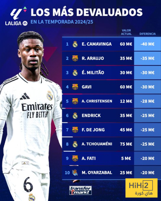 يليه مدافع البارسا رونالد أراوخو الذي خسر نصف قيمته السوقية (35 مليون يورو) ، بينما حل لاعب الريال ايدير ميليتاو ثالثا بعدما خسر 30 مليون يورو من سعره بالتساوي مع جافي الذي حل رابعا.