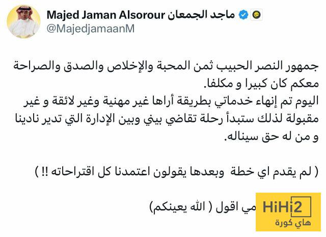 هاي كورة – أعلن ماجد الجمعان الرئيس التنفيذي لنادي النصر، رحيله عن منصبه بشكل رسمي، مشيرا إلى عزمه مقاضاة الإدارة الحالية التي تدير العالمي، بسبب رحيله بشكل غير لائق حسب وصفه.