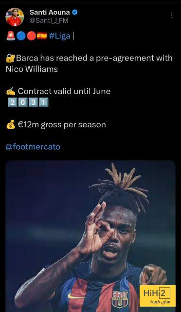 وفقًا للصحفي سانتي أوانا، توصل برشلونة إلى اتفاق مبدئي مع النجم الإسباني نيكو ويليامز، جناح أتلتيك بلباو، على توقيع عقد يمتد حتى يونيو 2031.