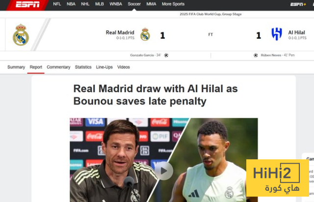 – شبكة “ESPN” العالمية: ريال مدريد يتعادل بصعوبة 1-1 مع الهلال، وبونو يتألق بتصديه لركلة جزاء حاسمة في اللحظات الأخيرة من فالفيردي.