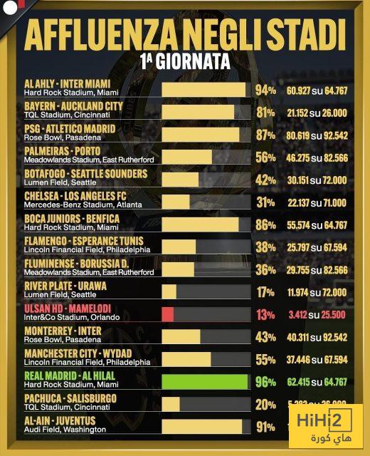 بينما كان الأدنى على الإطلاق في مباراة ماميلودي صانداونز وأولسان هيونداي ، والتي شهدت حضور 3,412 مشجعًا فقط بنسبة 13% في ملعب “إنتر” في أورلاندو.
