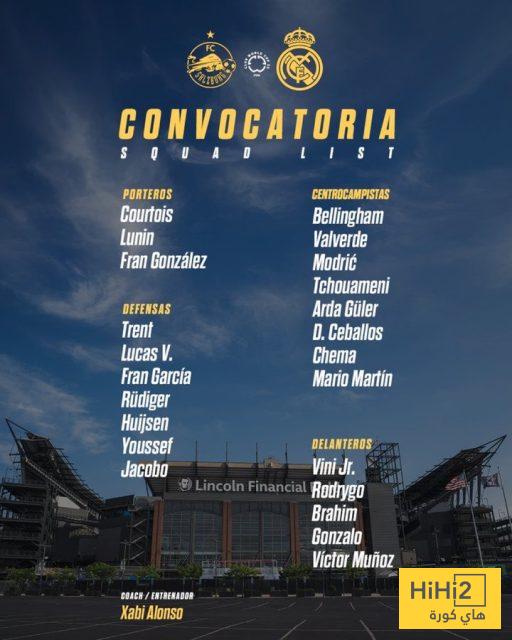 هاي كورة- أعلن تشابي ألونسو مدرب ريال مدريد عن قائمة فريقه الرسمية لمواجهة سالزبورغ، فجر يوم الجمعة، على ملعب فاينانشال فيلد، ضمن منافسات الجولة الثالثة من كأس العالم للاندية.