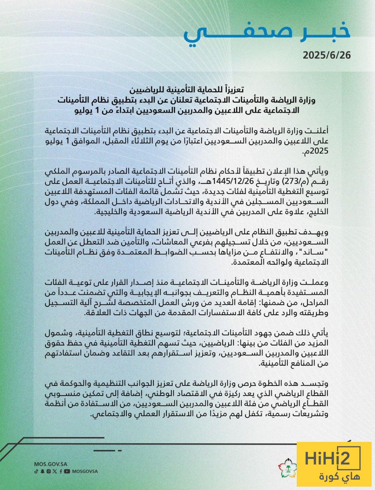 هاي كورة – أعلنت وزارة الرياضة عن بدء تطبيق نظام التأمينات الاجتماعية للاعبين والمدربين السعوديين، وذلك ابتداءً من يوم الثلاثاء الموافق 1 يوليو 2025.