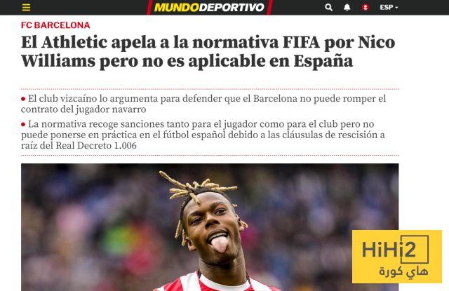 هاي كورة – في تطور جديد ومثير في ملف انتقال نيكو ويليامز إلى برشلونة، كشفت صحيفة موندو ديبورتيفو الكتالونية أن نادي أتلتيك بلباو لجأ إلى الاتحاد الدولي لكرة القدم لمحاولة منع إتمام الصفقة، مستندًا إلى ما يُعرف بـ”الحق المحمي” الذي يكفله الفيفا للاعبين في سنواتهم التعاقدية الأولى.