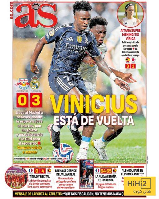 هاي كورة – عنونت صحيفة الآس الإسبانية عبر غلاف عددها الصادر اليوم السبت ” عودة فينيسيوس ” وذلك إثر تألق النجم البرازيلي أمام سالزبورغ في مونديال الأندية وقيادته الريال لحسم التأهل لثمن النهائي، في صدارة مجموعته.