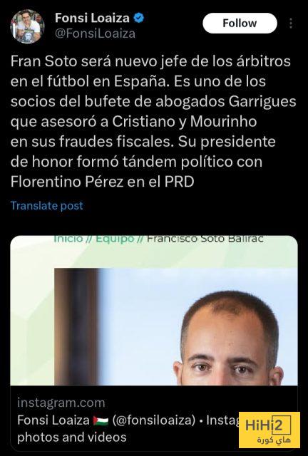 هاي كورة: أثار الصحفي الإسباني فونسي لوايزا جدلاً واسعًا عبر حسابه على منصة “X”، عقب إعلان تعيين فران سوتو رئيسًا جديدًا للجنة الحكام في كرة القدم الإسبانية.