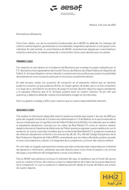 بعد دراسة المعلومات المتوفرة حول الحكم الصادر يوم الثلاثاء 1 يوليو 2025 عن المحكمة الإدارية المركزية رقم 4 في مدريد، والذي قبل الطعن المقدم من رابطة الدوري الإسباني (لا ليغا) وأمر بإعادة فتح ملف الإجراءات التأديبية المتعلقة بالفيديوهات التي نشرها نادي ريال مدريد ضد الطاقم التحكيمي، نود أن نعرب عن ارتياحنا في جمعية AESAF لهذا القرار.