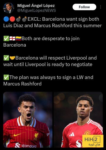 هاي كورة – قال الصحفي ميغيل أنخيل لوبيز إن نادي برشلونة يرغب في التعاقد مع لويس دياز، لاعب ليفربول، وماركوس راشفورد، نجم مانشستر يونايتد، معًا هذا الصيف، وذلك بعد فشل صفقة نيكو ويليامز.