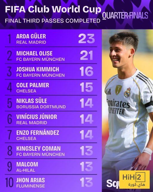 هاي كورة – واصل النجم التركي الشاب أردا غولر تألقه اللافت مع ريال مدريد، وهذه المرة في ربع نهائي كأس العالم للأندية، بعدما تصدّر قائمة اللاعبين من حيث عدد التمريرات المكتملة في الثلث الأخير من الملعب.