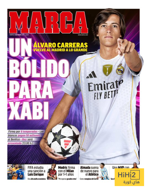 هاي كورة- تصدر الفارو كاريراس لاعب ريال مدريد الجديد غلاف صحيفة ماركا الاسبانية بعد أن أعلن الريال عن التعاقد رسميا معه حتى 2031 ، امس الاثنين.