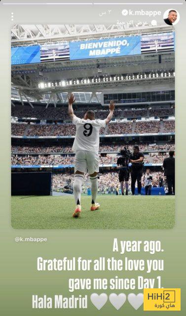 وكتب مبابي: “مر عام.. ممتن لكل الحب الذي منحتوه لي منذ اليوم الأول، هلا مدريد!”